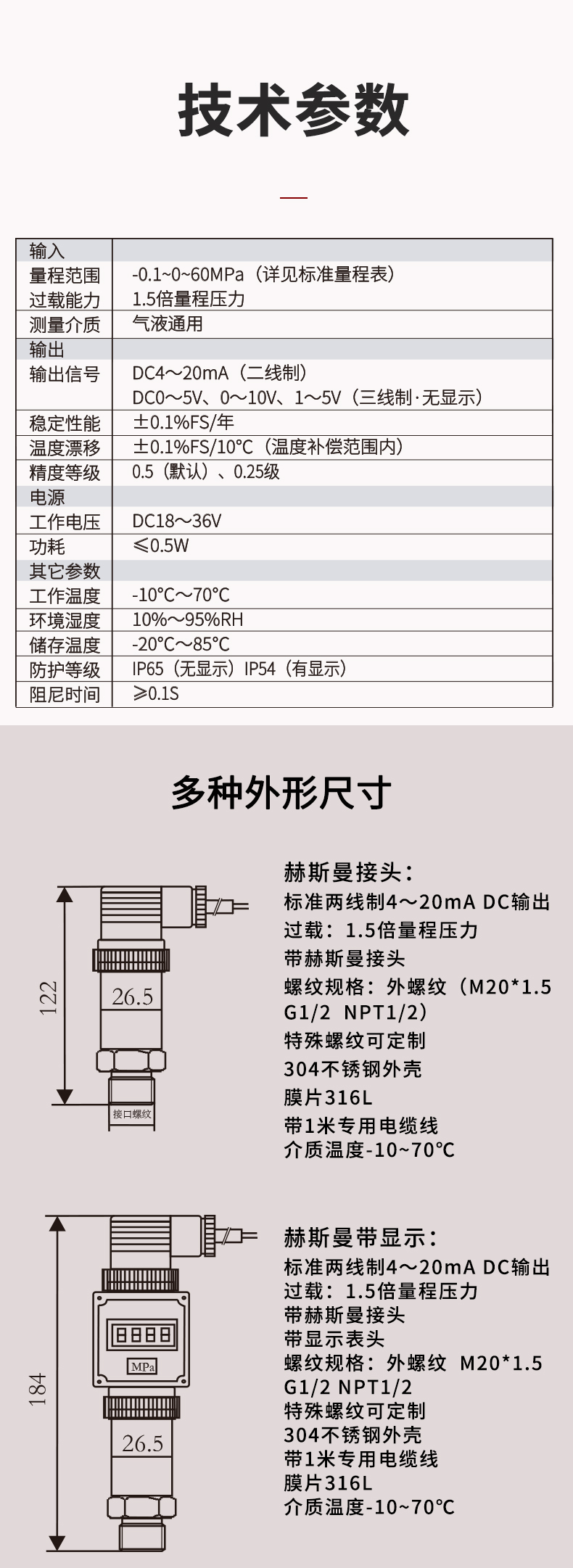 虹潤公司是專業(yè)生產(chǎn)壓力變送器的國家專精特新“小巨人”企業(yè),生產(chǎn)的小巧型壓力變送器,具有采用進口芯體,量程范圍寬,抗沖擊抗震動,多種螺紋接口,性能穩(wěn)定等特點。產(chǎn)品獲得一種數(shù)字顯示低功耗壓力表、一種信號發(fā)生器裝置等2項國家發(fā)明專利,主持起草工業(yè)過程控制系統(tǒng)用模擬輸入兩位或多位輸出儀表、工業(yè)過程測量和控制系統(tǒng)用壓力/差壓變送器等2項國家標準,通信系統(tǒng)多通道數(shù)據(jù)采集控制終端規(guī)范軍用標準,以及現(xiàn)場設(shè)備集成等5項智能制造國家標準,參與國際5G標準制定,取得數(shù)顯壓力表等2項相關(guān)軟件著作權(quán)。產(chǎn)品廣泛應(yīng)用于化工、食品、制藥、電力、設(shè)備配套、供暖、水處理、樓宇等行業(yè),需精準測量流體壓力的現(xiàn)場。