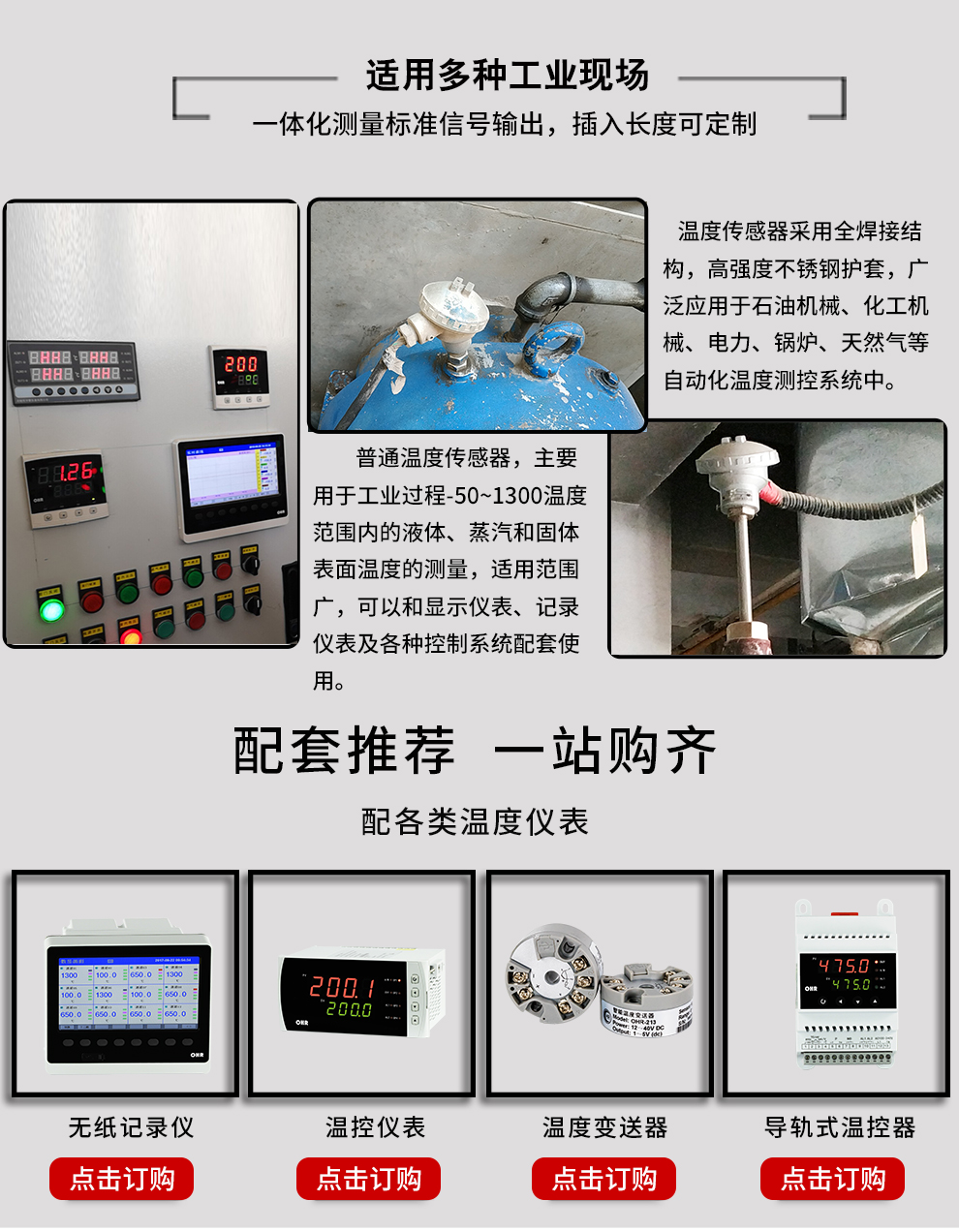 裝配式熱電阻熱電偶作為溫度測量傳感器,通常與溫度變送器、調節器及顯示儀表等配套使用,組成過程控制系統,用以直接測量或控制各種生產過程中流體、蒸汽和氣體介質以及固體表面等溫度。