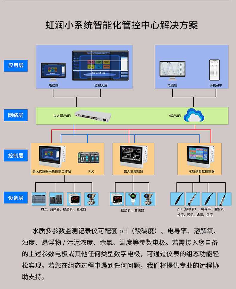 虹潤公司是專業生產水質分析儀的國家專精特新“小巨人”企業。生產的水質多參數監測記錄儀,具有多參數采集同屏顯示,數據記錄與轉存,支持WiFi或4G實現數據云方案,內置與外配組態軟件等特點。產品獲得一種適應性強PH控制儀、嵌入式數據采集工作站、數據采集控制工作站、無紙記錄儀、智能化控制器等5項國家發明專利;主持起草通信系統多通道數據采集控制終端規范軍用標準,物聯網智能記錄儀表通用技術條件國家標準,以及現場設備集成等5項智能制造國家標準,參與國際5G標準制定;取得PH無紙記錄儀等7項相關軟件著作權。產品廣泛應用于實驗室、水處理、環境監測、食品、制藥、農業、工業流程控制等諸多領域。